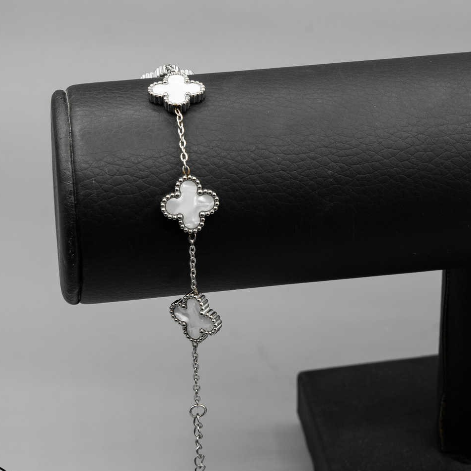The stylish bracelet is made up of 5 iconic 4-leaf clover motifs, each set with a beaded edge and pearl inlay, set throughout the length of the chain.
