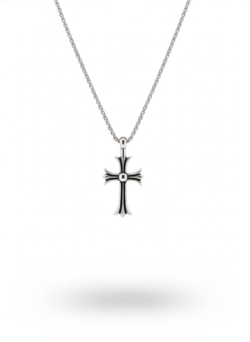 double-sided Gothic-inspired cross pendant on a silver-toned chain. The design combines historical architecture with modern luxury, offering two distinct aesthetics in one piece.