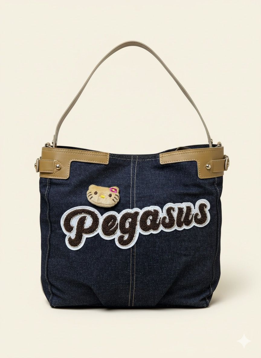 Take your style to new heights with the Pegasus Collegiate Tote. This spacious and stylish bag features a durable navy blue canvas or nylon body contrasted with tan leather-look trim and handles. The front is boldly embroidered with the word "Pegasus" in a fun, vintage varsity script, giving it a playful, athletic-meets-retro charm.