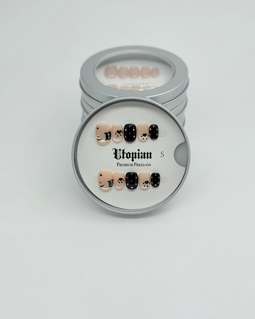 This set is designed for effortless edgy glamour, featuring a sophisticated palette of deep matte black and warm, creamy nude. The magic is in the decals: enjoy nails with fun, alternating motifs—whether they're whimsical kitten silhouettes or subtle heart details. Durable, reusable, and housed in a sleek metal tin, this set provides a perfect blend of cute and chaotic chic for the ultimate goth aesthetic.